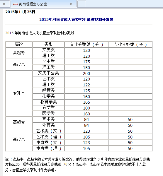 2015年河南省成人高校招生录取控制分数线