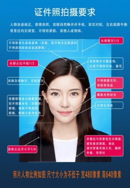 4.采集时一定真实表达员工本人相貌,请勿画浓妆和美颜,尽量使用手机自带相机拍摄或到照相馆照相后在线提交,禁止对图像整体或局部进行镜像、旋转等变换操作,不得对人像特征进行修饰处理,不得添加边框、文字、装饰图案等其他内容。图像信息须正面免冠照,禁穿蓝色衣服(背景为自动生成天蓝色),具体要求见下图。