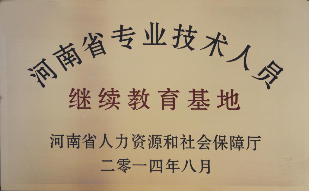 为贯彻实施河南省百万专业技术人才知识更新工程,加快培养经济社会发展重点领域高层次、急需紧缺和骨干专业技术人才,经公司积极申报,省教育厅推荐及专家评议,河南省人力资源社会保障厅研究决定,授予公司省级专业技术人员继续教育基地称号(豫人社专技〔2014〕61号),给予一次性专项经费补助十万元。公司将以此为契机,根据省人力资源社会保障厅相关文件精神,结合公司实际,扎实推进基地建设,探索创新培训模式,建立健全规章制度,使公司省级专业技术人员继续教育基地起到引领和示范作用。