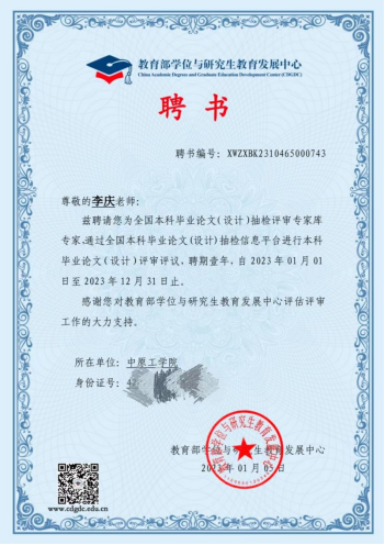 近日,教育部学位与研究生教育发展中心向公司李庆教授颁发“教育部全国本科毕业论文(设计)抽检评审专家库专家”聘书。